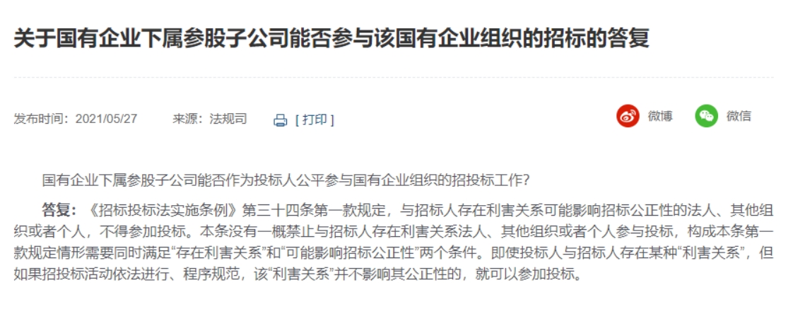 一、关于国有企业下属参股子公司能否参与该国有企业组织的招标的答复。国有企业下属参股子公司能否作为投标人公平参与国有企业组织的招投标工作?