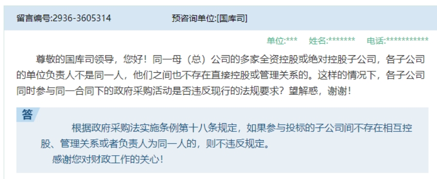 四、同一母(总)公司的多家全资控股或绝对控股子公司,各子公司的单位负责人不是同一人,他们之间也不存在直接控股或管理关系的。这样的情况下,各子公司同时参与同一合同下的政府采购活动是否违反现行的法规要求?